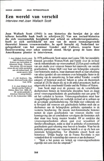 Ter ere van het aankomende themanummer over gendergeschiedenis publiceert Skript enkele oude interviews met prominente historici en academici op de website. Dit keer Joan Wallach Scott, auteur van "Gender: A useful Category of Historical Analysis" (AHR 1986), hét klassieke artikel van de gendergeschiedenis. In 1989 interviewden oud-redacteurs Saksia Jansens en Anja Petrakopoulos haar over dit artikel, vrouwen- en gendergeschiedenis en haar loopbaan als historica.